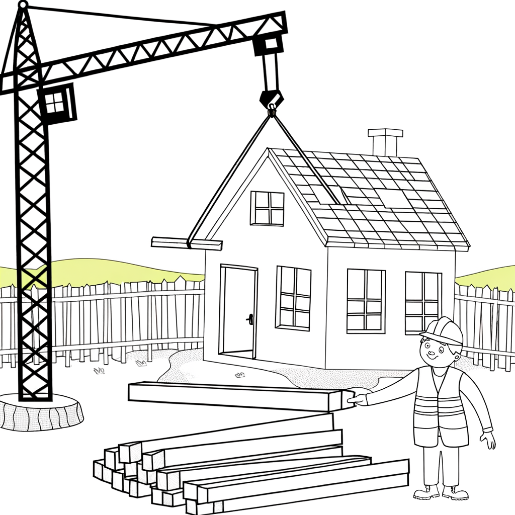Ein detailreiches Ausmalbild einer Baustelle mit einem großen Kran, der einen Holzbalken hebt, einem halb fertigen Haus und einem fleißigen Bauarbeiter.