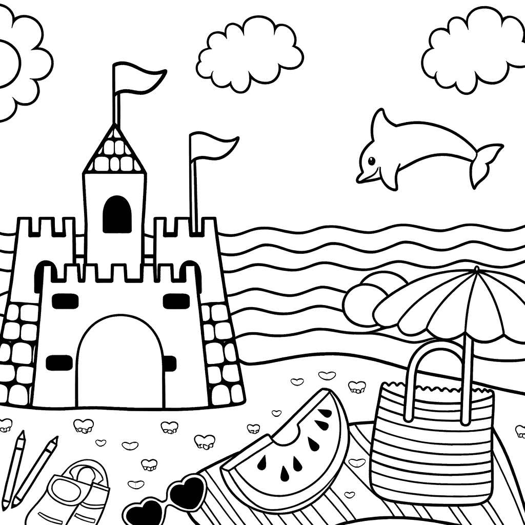 Ein detailreiches Ausmalbild für den Sommer: Gestalte eine prächtige Sandburg mit Flagge, eine Strandtasche und eine erfrischende Wassermelone. Im Hintergrund springt ein fröhlicher Delfin aus den Meereswellen.