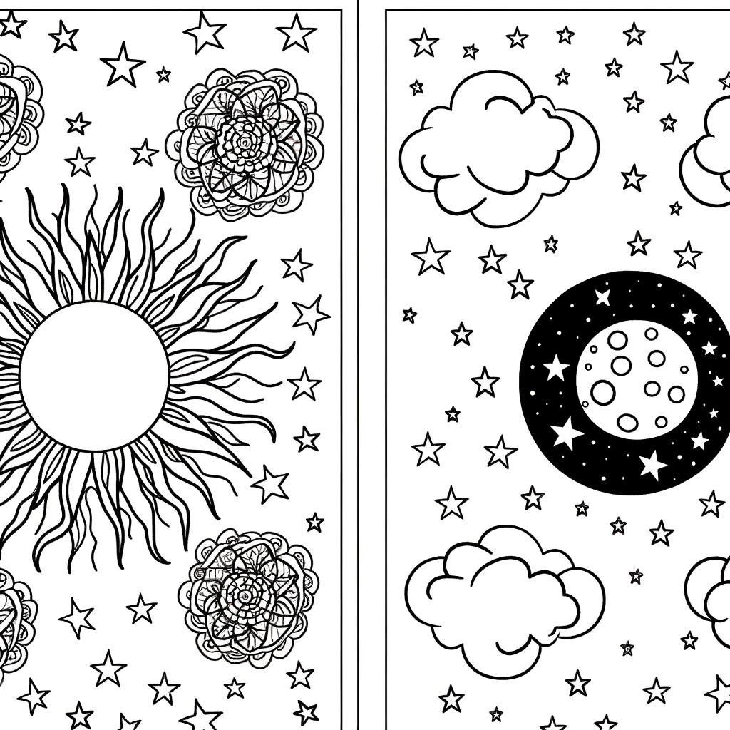 Ausmalbild Sonne, Mond & Sterne: Himmlische Tag-und-Nacht-Karte
