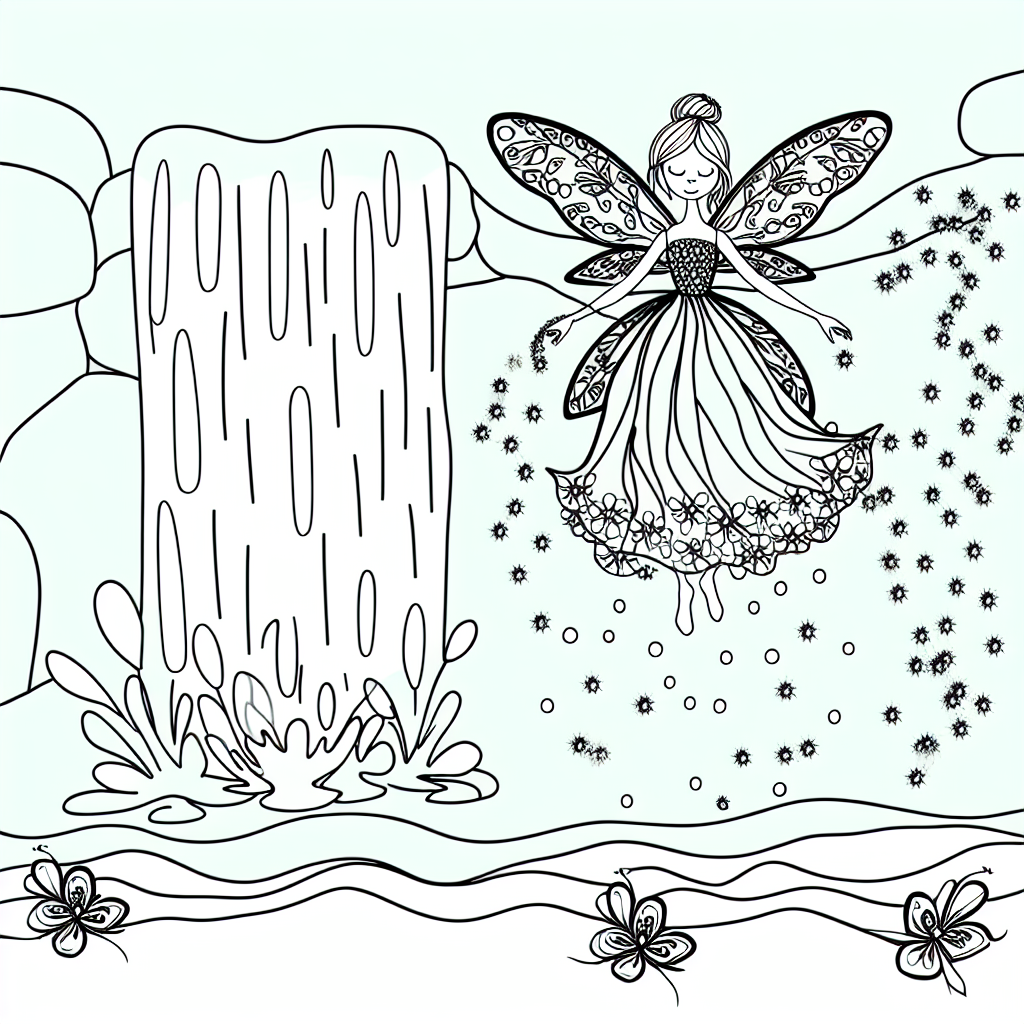 Entdecke die zauberhafte Welt der Feen mit diesem Ausmalbild! Die schwebende Fee am Wasserfall ist umgeben von glitzernden Wassertropfen. Ihr elegantes Kleid mit blumigen Mustern und die filigranen Flügel laden zum kreativen Ausmalen ein. Perfekt für kleine Künstler, die ihre Fantasie entfalten wollen!