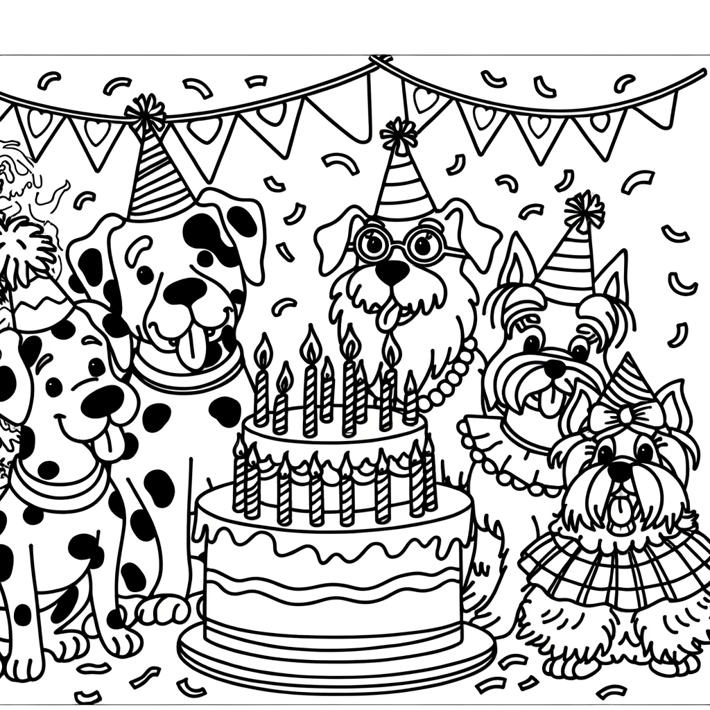 Lade dieses detailreiche Ausmalbild einer lustigen Hunde-Geburtstagsparty herunter! Mit Dalmatiner, Bulldogge und Terrier, die zwischen Girlanden, Konfetti und einem großen Geburtstagskuchen feiern.