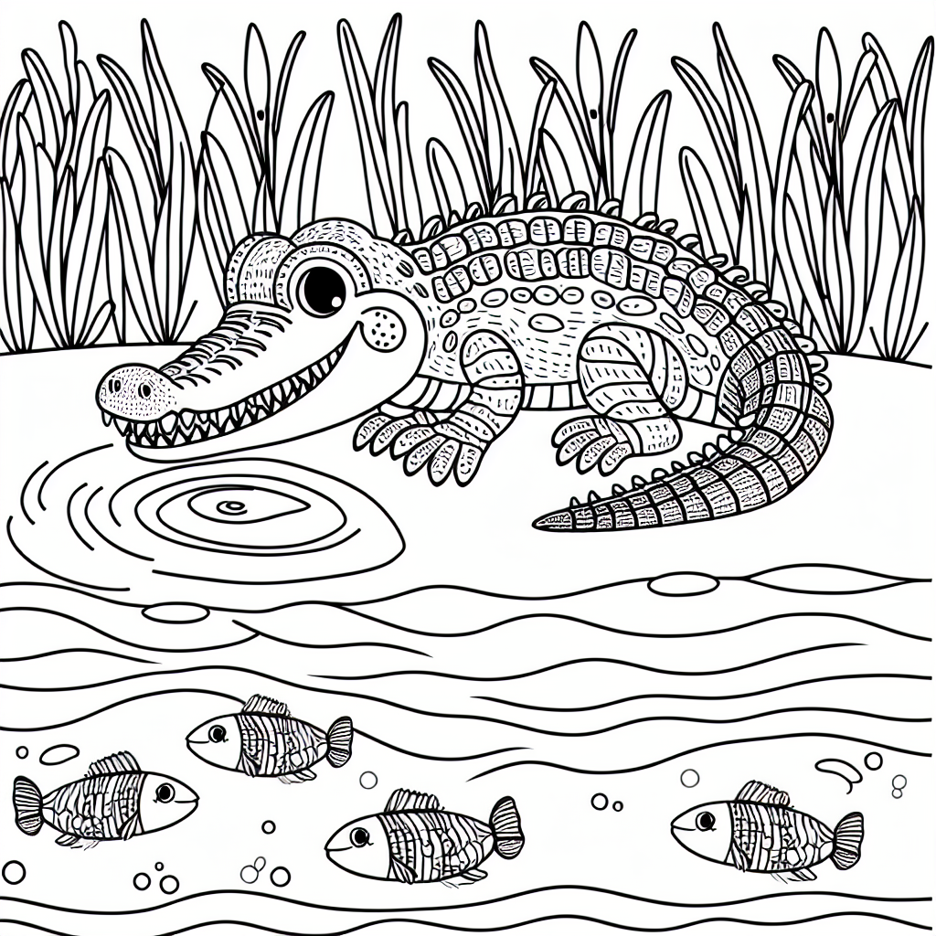 Lass deiner Kreativität freien Lauf mit diesem süßen Ausmalbild eines kleinen Krokodils, das am Wasser sitzt und mit seiner Zunge spielt. Umgeben von bunten Fischen und Wasserpflanzen, lädt dieses Bild Kinder ein, die Details seiner Schuppen und den breiten, freundlichen Mund auszumalen. Perfekt für Tierliebhaber!