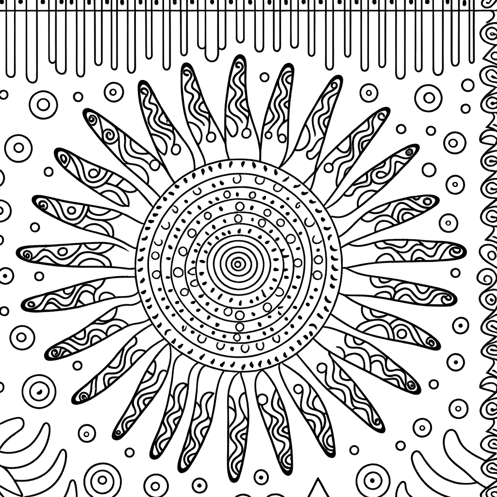 Ein detailreiches Mandala in Form einer strahlenden Sonne. Die Sonnenstrahlen sind mit feinen Mustern aus Kreisen, Dreiecken und Wellen gefüllt – ideal für entspanntes Ausmalen.