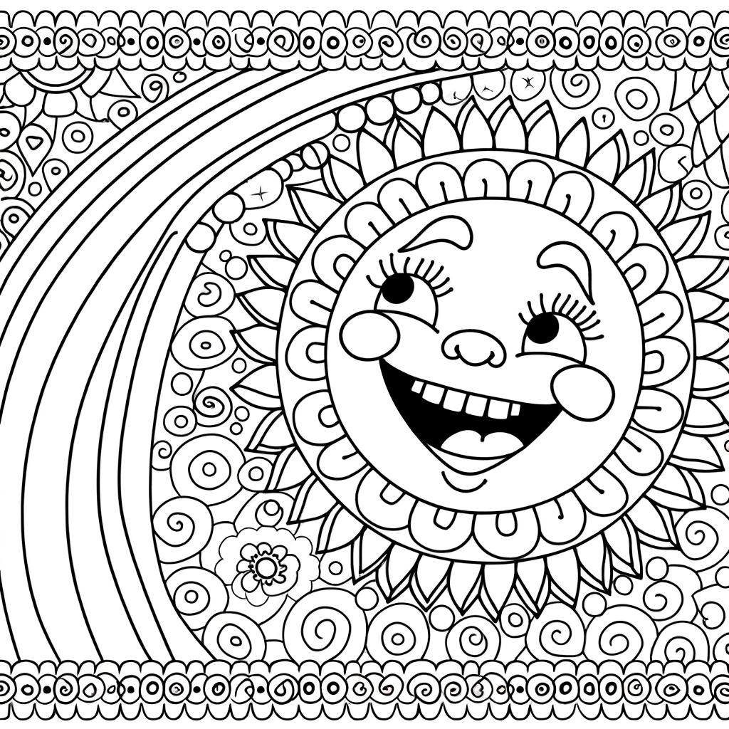 Ein fröhliches Ausmalbild mit einer lachenden Sonne, die hinter einem einfachen Regenbogen hervorschaut. Perfekt für Kleinkinder durch große Flächen und klare Linien.