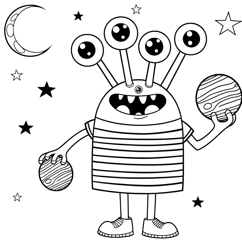 Ein lustiges Monster aus dem Weltraum mit drei Augen und vier Armen jongliert im Weltall mit Planeten. Es trägt ein gestreiftes T-Shirt vor einem Hintergrund mit Sternen und Mond.