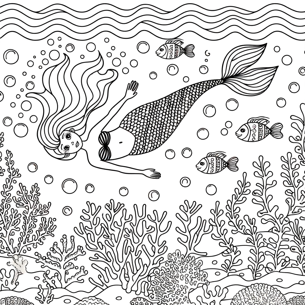 Tauche ein in eine detailreiche Unterwasserwelt! Dieses anspruchsvolle Ausmalbild zeigt eine wunderschöne Meerjungfrau inmitten von Korallenriffen, exotischen Fischen und filigranen Wasserpflanzen. Perfekt für fortgeschrittene Künstler ab 10 Jahren.