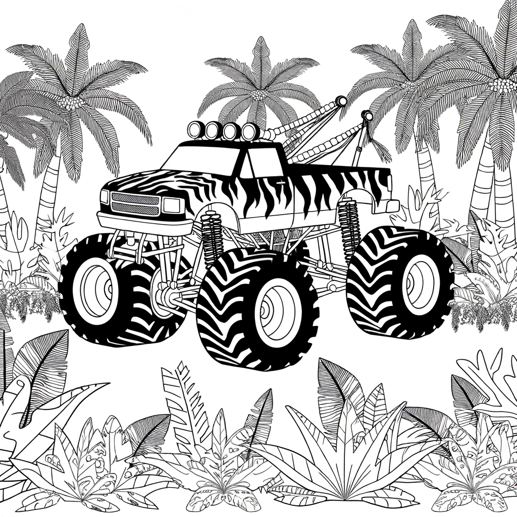 Ausmalbild eines Monstertrucks mit wilden Tigerstreifen im Dschungel. Entdecke tolle Details wie Stoßdämpfer und Federn zwischen Palmen und Farnen.