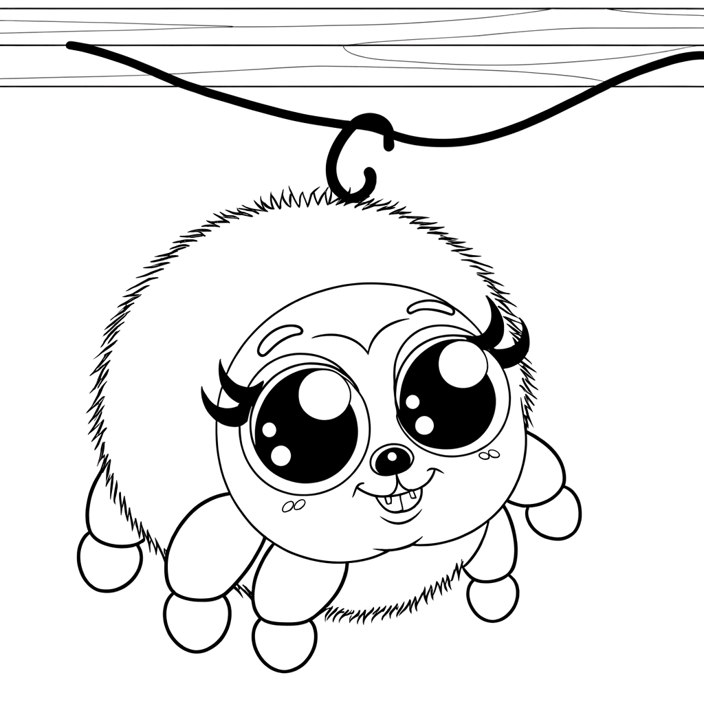 Ein kinderfreundliches Ausmalbild einer dicken, süßen Spinne, die an einem Faden hängt. Mit großen Augen und einfachen Formen perfekt für kleine Künstler.