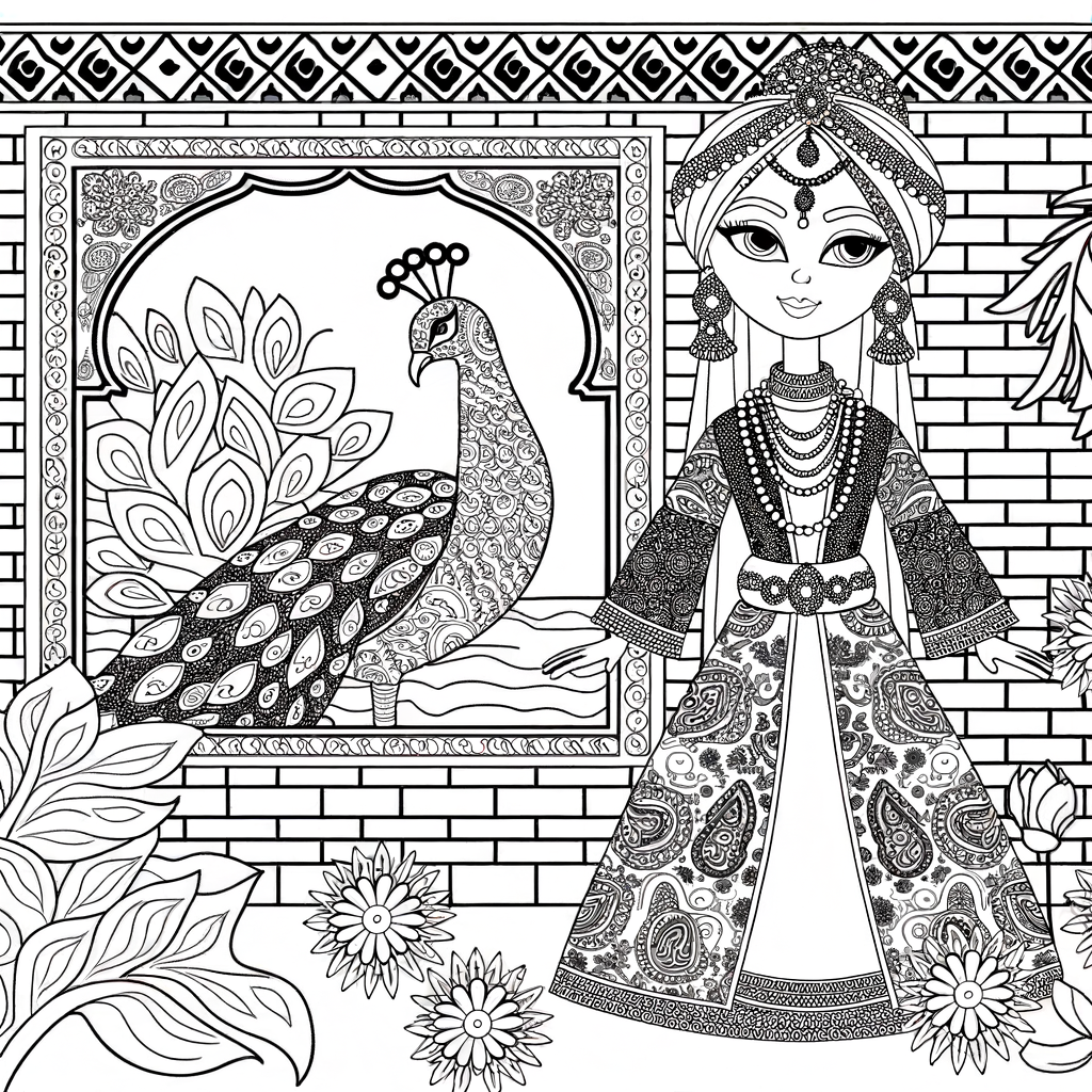 Male eine wunderschöne orientalische Prinzessin in einem prunkvollen Garten aus. Das Motiv besticht durch Paisley-Muster, Edelsteine, detailreiche Mosaikfliesen und einen prachtvollen Pfau.