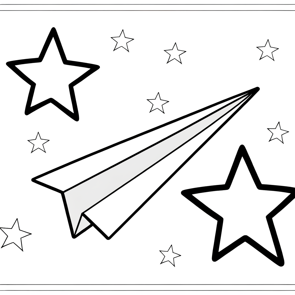 Ein einfaches Papierflugzeug segelt in einer sanften Kurve durch die Luft, begleitet von drei großen Sternen im Hintergrund. Ideal für kleine Kinder zum Ausmalen.
