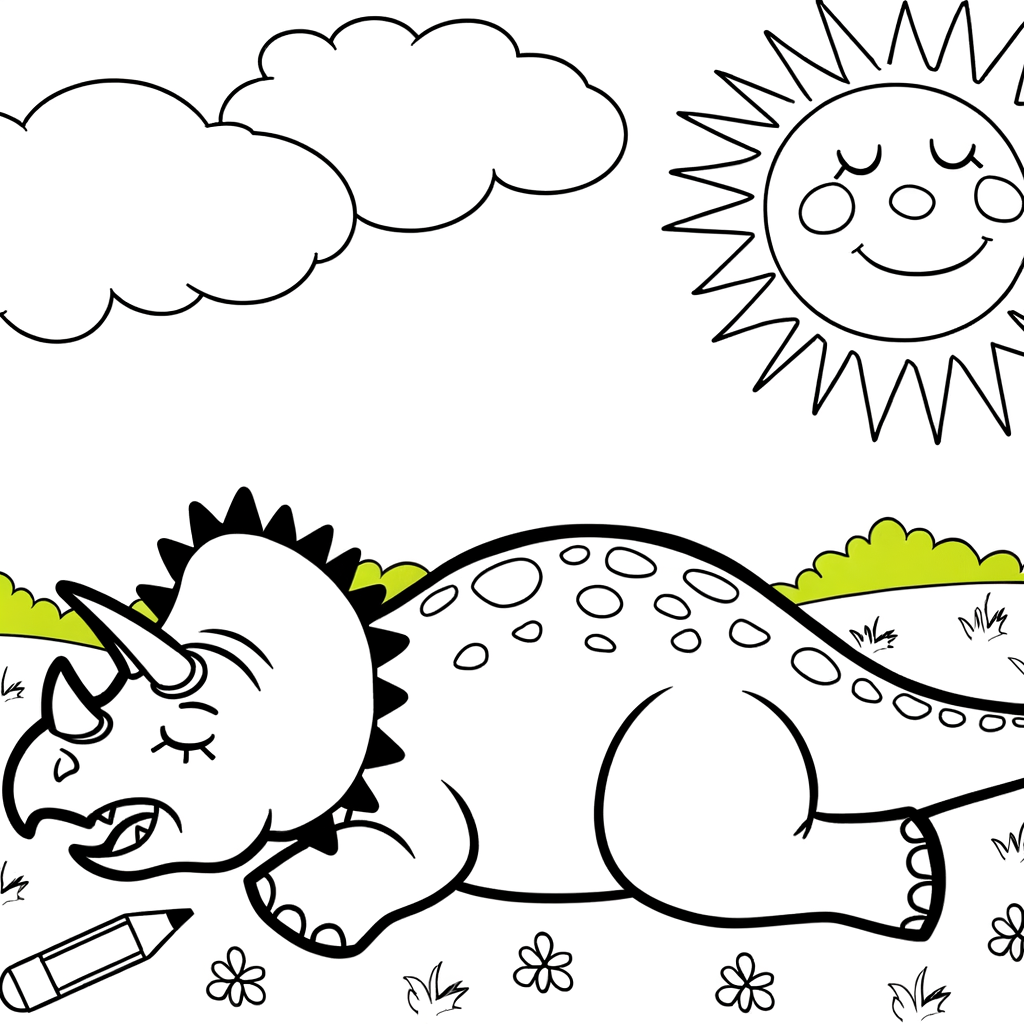 Ein kinderleichtes Ausmalbild mit einem schlafenden Triceratops auf einer Wiese. Die großen Flächen und klaren Linien sind ideal für kleine Kinder und Malanfänger.