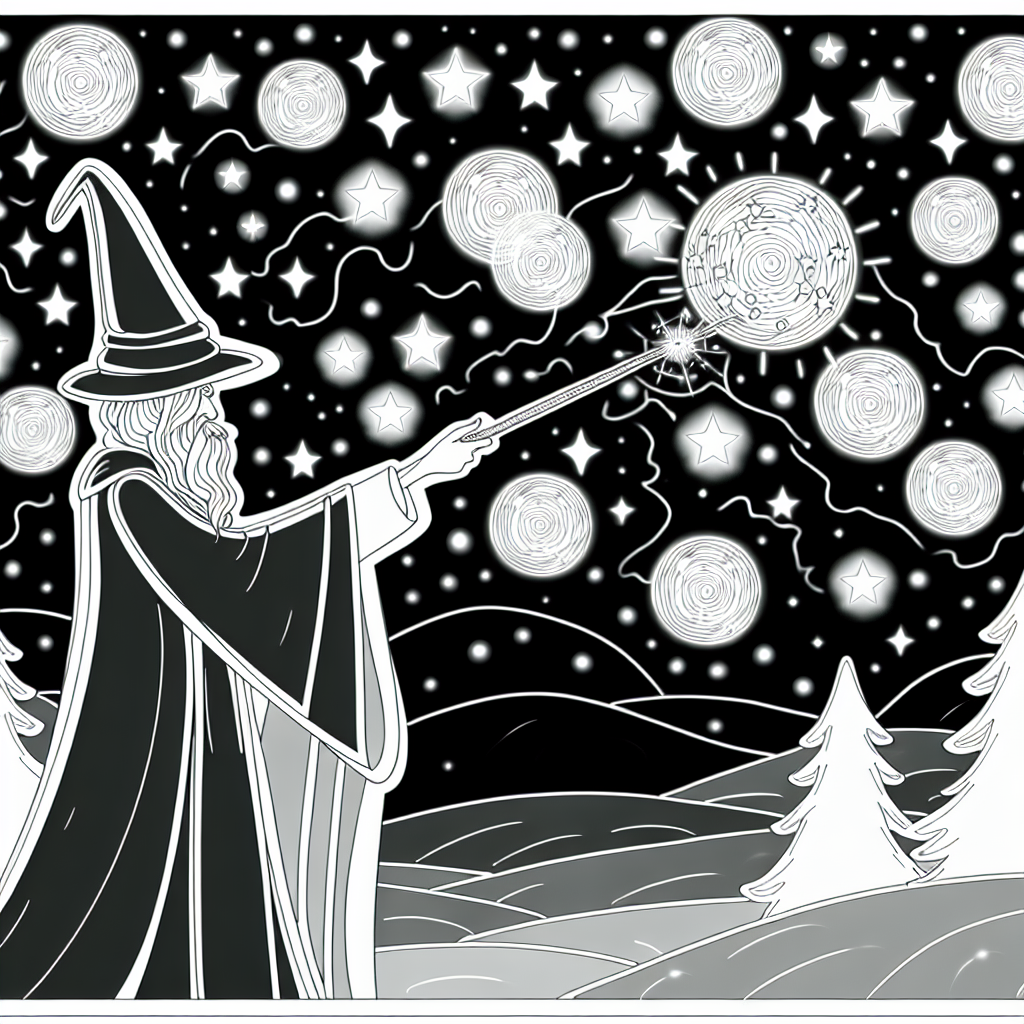 Male einen zauberhaften Nachtzauberer, der mit seinem Zauberstab einen funkelnden Sternenhimmel heraufbeschwört. Um ihn tanzen leuchtende Lichtkugeln, während im Hintergrund die Silhouetten von Bäumen sichtbar sind. Lass deiner Kreativität freien Lauf und bringe diese magische Szene zum Leben!