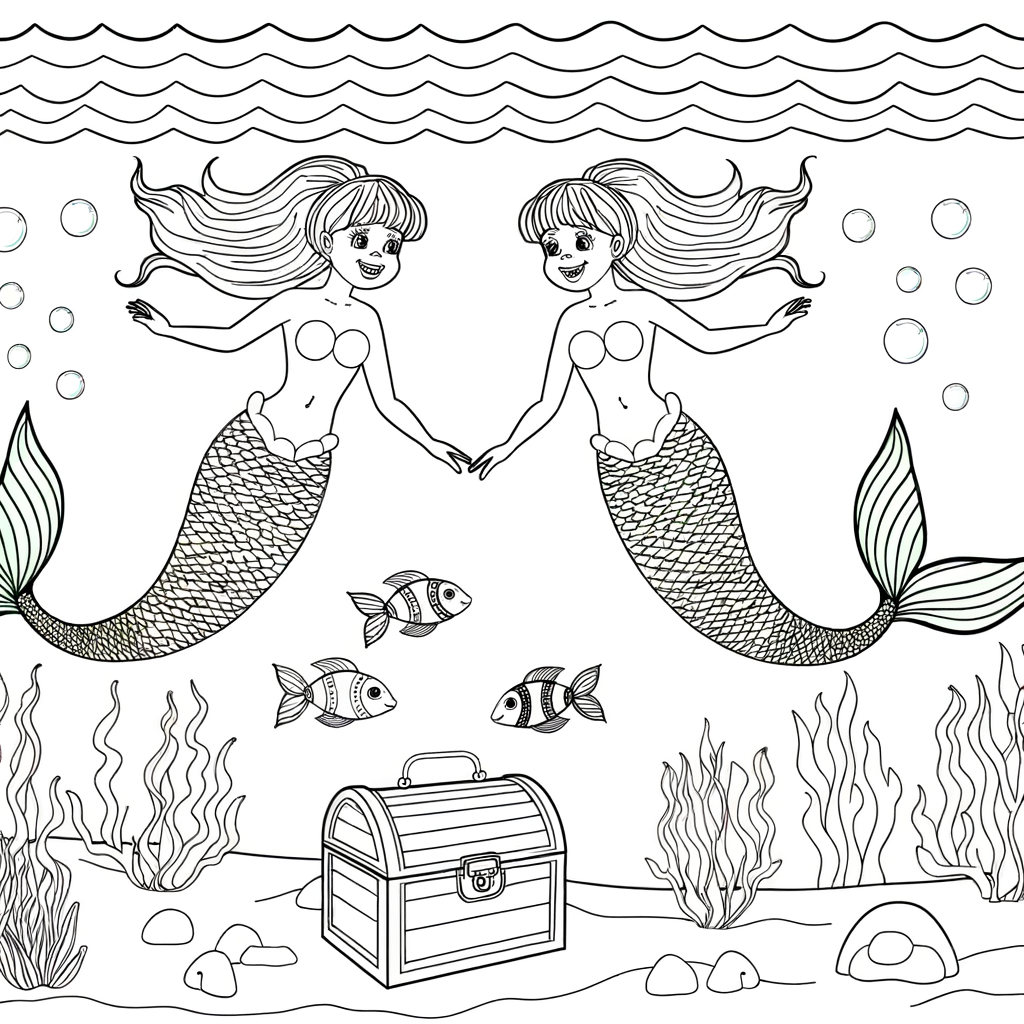Male zwei beste Meerjungfrauen-Freundinnen aus, die gemeinsam die Unterwasserwelt erkunden. Mit detailreichen Schuppen, einer geheimnisvollen Schatztruhe und Wasserpflanzen.