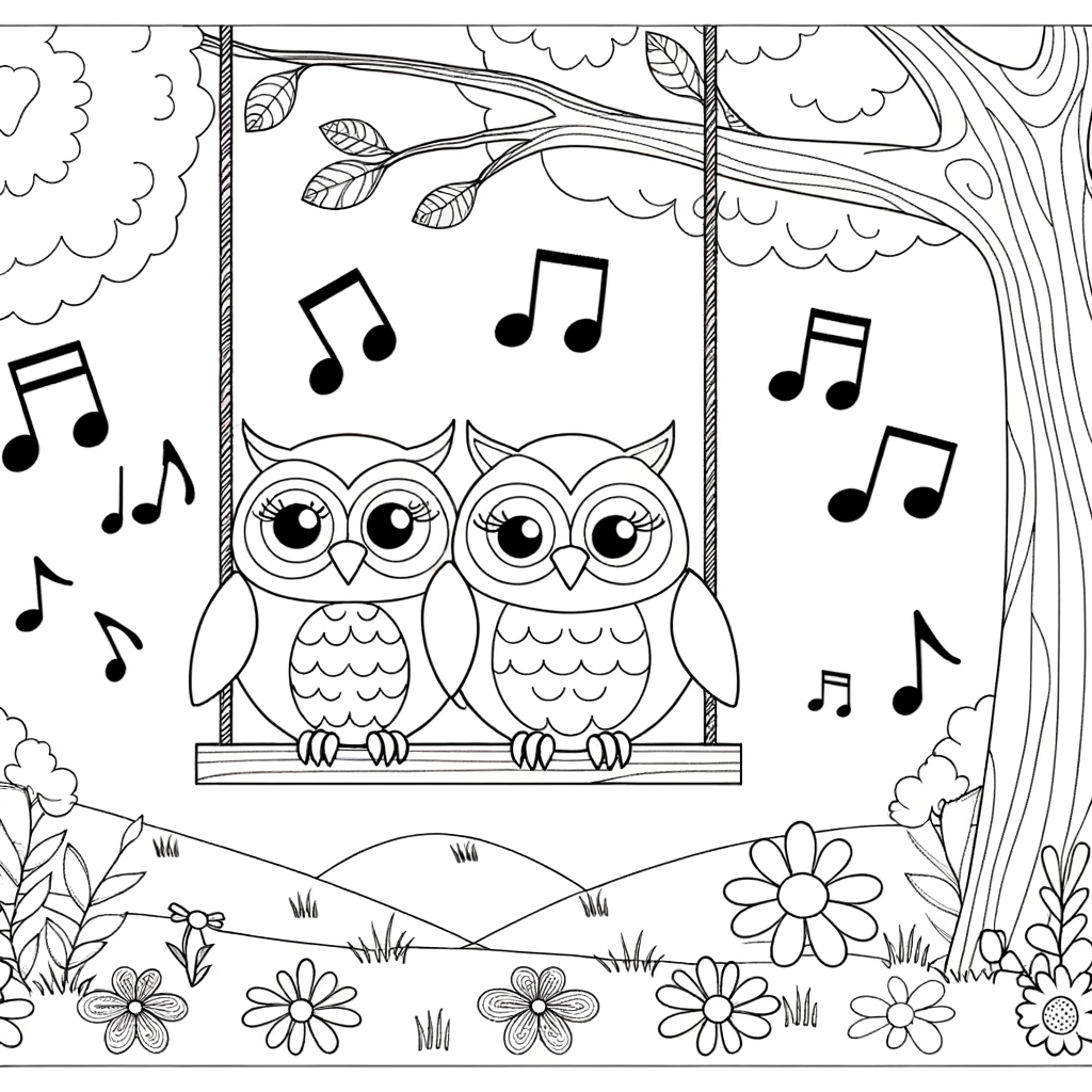 Ein zauberhaftes Ausmalbild mit zwei Eulen, die gemeinsam auf einer Schaukel an einem Ast sitzen und singen. Umgeben von Noten und einer idyllischen Waldlandschaft mit Blumen.