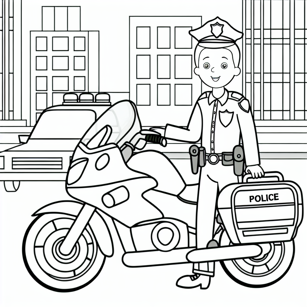 Laat je creativiteit de vrije loop met deze kleurplaat van een politie-motor die door de stad rijdt. De vriendelijke politieagent en duidelijke lijnen maken het gemakkelijk en leuk voor kinderen om hun favoriete kleuren te kiezen en de afbeelding tot leven te brengen. Perfect voor kleine kunstenaars!